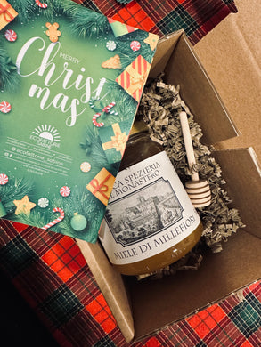 Christmas Beauty Box di Ecofattorie Sabine con olio extravergine, cioccolata, confettura, pecorino, biscotti e Christmas Tote Bag
