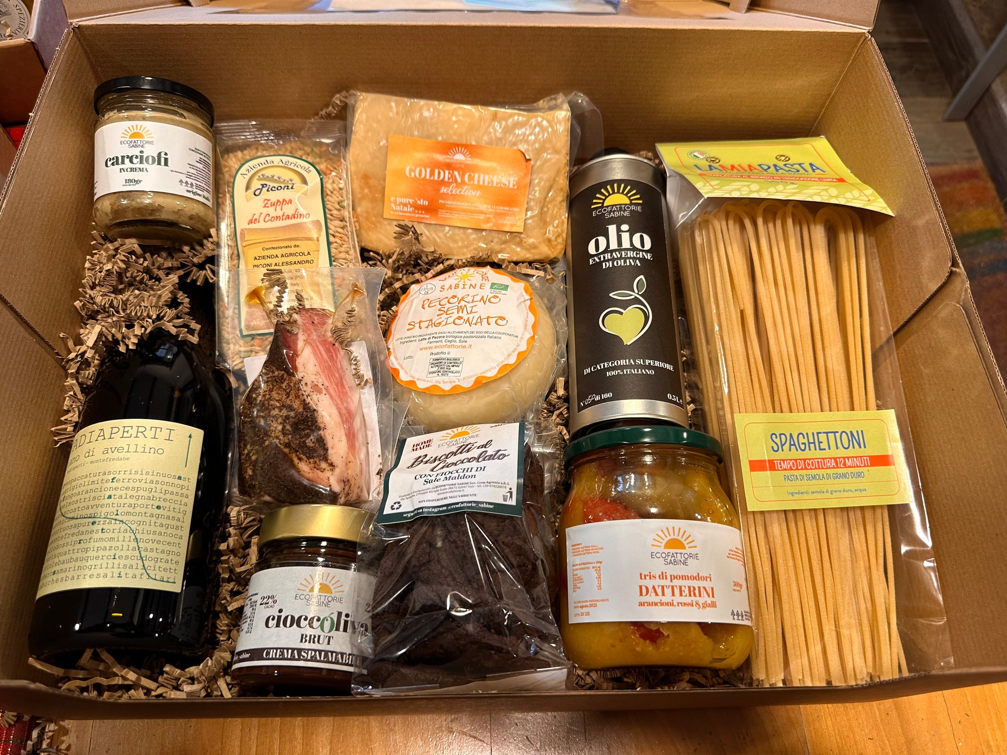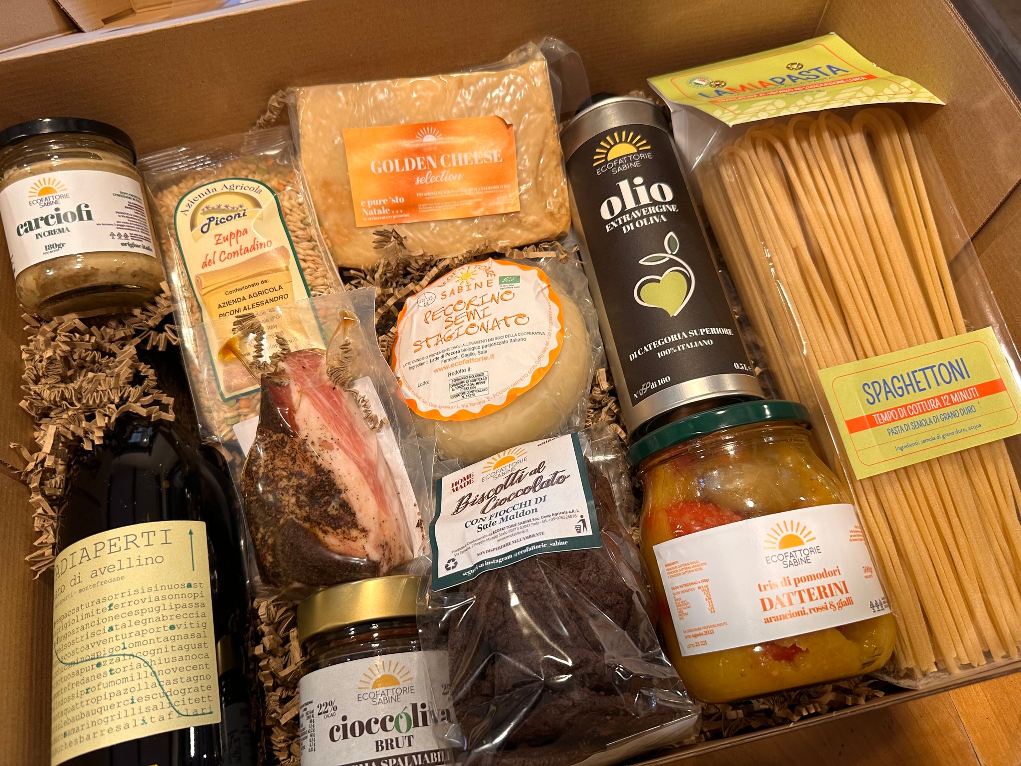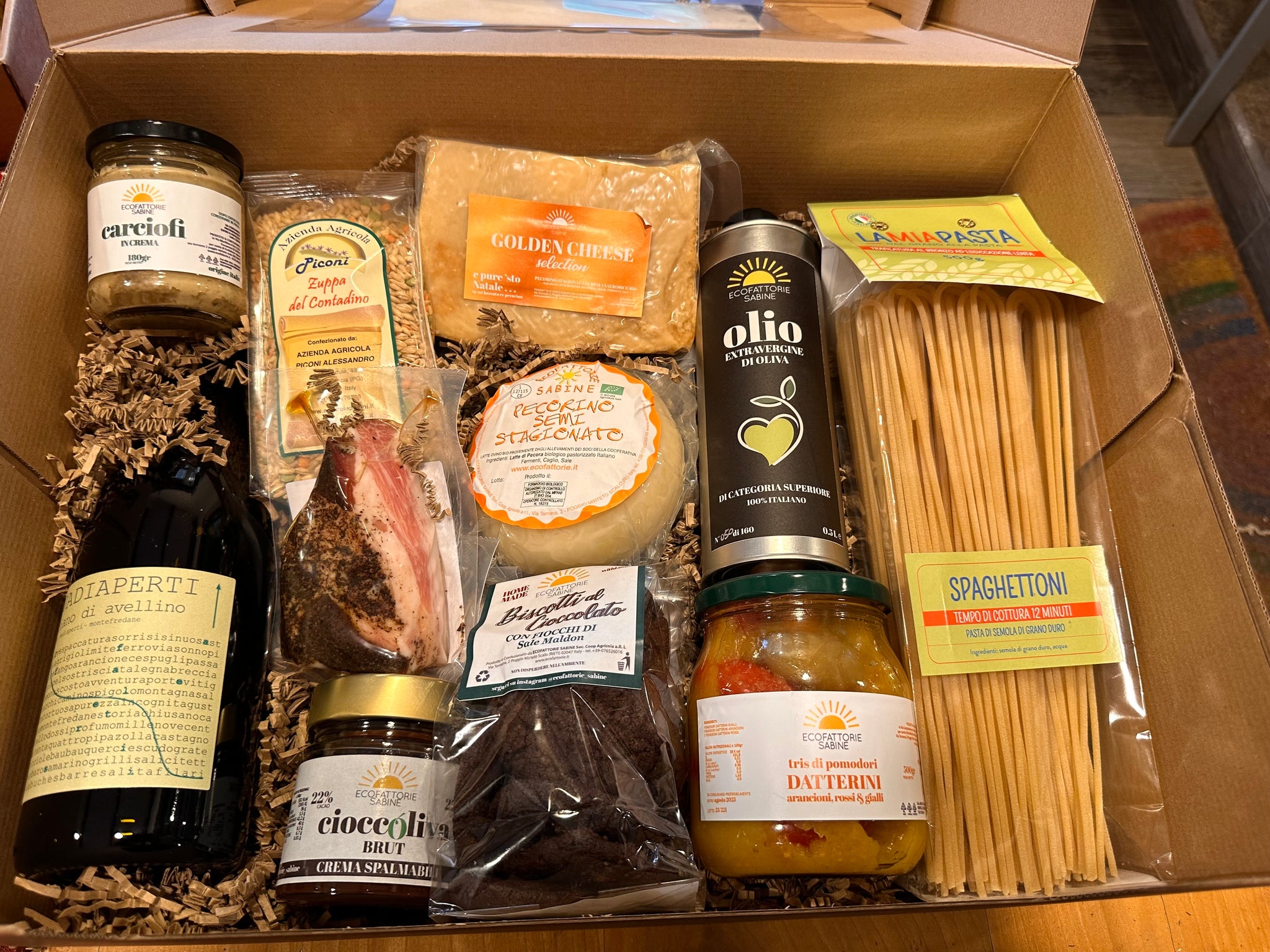Contiene : 1 bottiglia di vino biologico, una bottiglia di olio extravergine di oliva da 500ml, 1 crema spalmabile all’olio di oliva, 1 pecorino semistagionato bio 500gr, 1 spicchio di pecorino stagionato 400gr, 1 pacco di pasta artigianale, 1 confezione di biscotti fatti in casa, 1 barattolo di pomodori datterini, 1 trancio di guanciale, 1 confezione di legumi artigianali e 1 crema di carciofi.